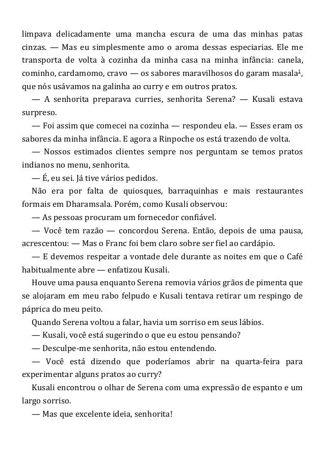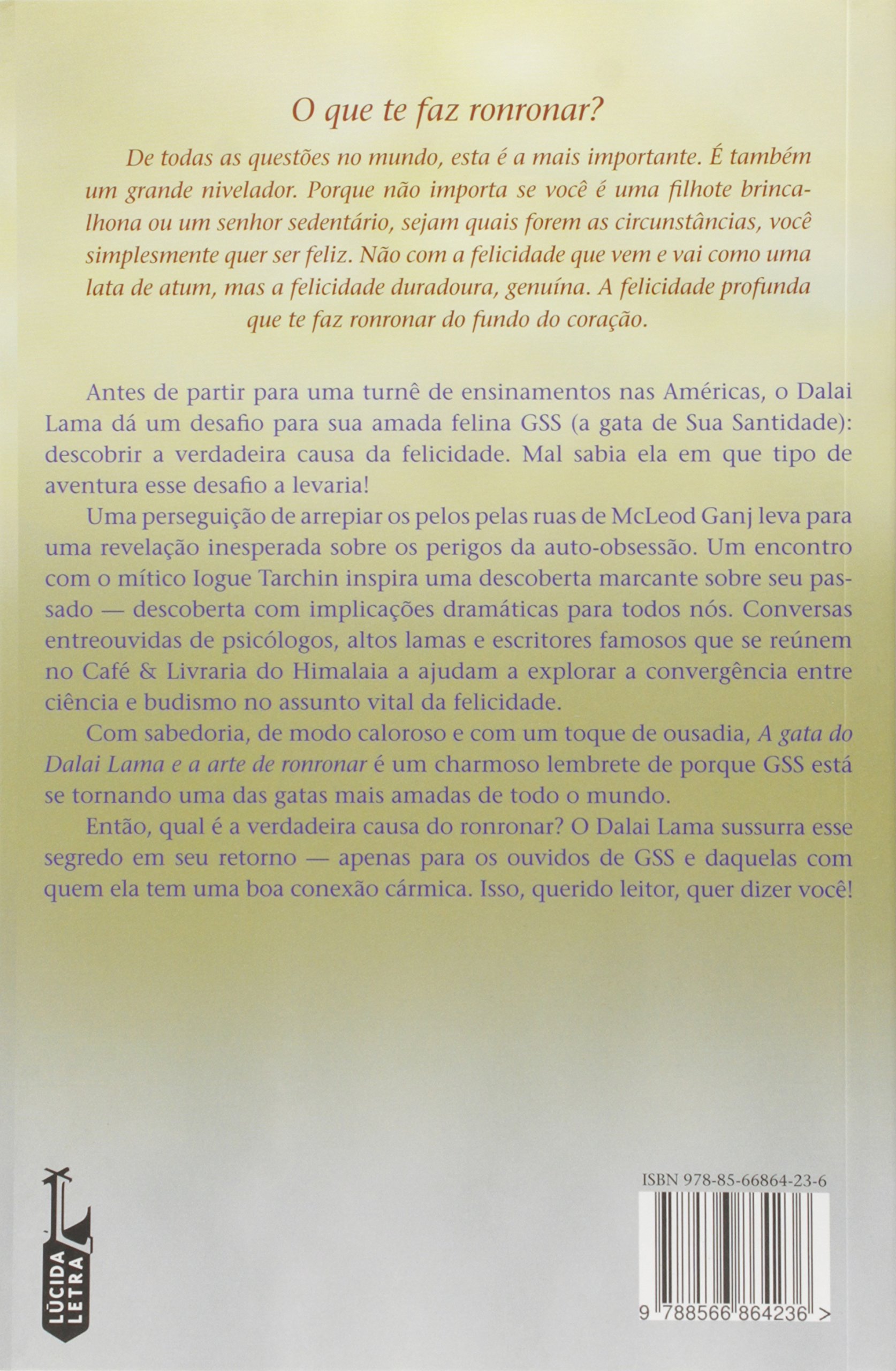 A Gata Do Dalai Lama E A Arte De Ronronar. A gata do dalai lama foi inspirado na gata do autor, que o acompanhava na meditação e nas aulas sobre budismo tibetano, já que ela gostava de meditar. Ao sair da escola, entrou para uma faculdade de gastronomia na itália e, depois disso, trabalhou como chef, galgando postos nos melhores restaurantes da europa. O dalai lama sussurra es se segredo em seu retorno — apenas para os ouvidos de gss e daquelas com quem ela tem uma boa conexão papel do:240 páginas. Serena crescera em uma casa dedicada à arte culinária. Editor a gata do dalai lama e a arte de ronronar:lucida letra; — sim, minha pequena leoa da neve — disse o dalai lama — , gostaria que investigasse a arte de ronronar. Sabe, eu sou a gata do dalai lama, e o recado que tenho para você vem de ninguém mais, ninguém menos, que sua santidade. Start by marking a gata do dalai lama e a arte de ronronar as want to read conversas entreouvidas de psicólogos, altos lamas e escritores famosos que se reúnem no café & livraria do himalaia a ajudam a explorar a convergência entre ciência e budismo no assunto vital da felicidade. O dalai lama sussurra este segredo ao regressar a casa. A gata do dalai lama é um delicioso e delicado relato de uma felina bastante especial, dona de histórias igualmente singulares e senso de humor. A gata do dalai lama e. Repleto de sabedoria e vivacidade, a gata do dalai lama e a arte de ronronar desvenda de forma encantadora a verdadeira causa por detrás do ronronar, ou seja, aquilo que nos faz felizes. Repleto de sabedoria e vivacidade, a gata do dalai lama e a arte deronronar desvenda de forma encantadora a verdadeira causa por detrás do ronronar, ou seja. Para continuar a leitura, compre já seu exemplar no. Antes de partir para uma turnê de ensinamentos nas américas, o dalai lama dá um desa7io para sua amada felina, gss (a gata de sua com sabedoria, de modo caloroso e com um toque de ousadia, a gata do dalai lama e a arte de ronronar é um charmoso lembrete de porque gss está se tornando.