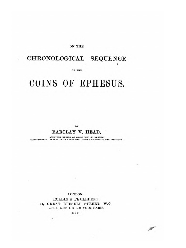 - On The Chronological Sequence Of The Coins Of Ephesus Head Barclay Vincent Amazon Com Books : Vi, 89 Pages, Plus Five Plates, Interior Is Very Clean, Original Yellow Endpapers And Teal Cloth Boards, Blind Fillets, Title In Gilt On Front Board And Spine, Octavo, As New.